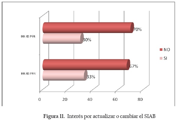 La pregunta sobre el interés de actualizar o cambiar el SIAB instalado se planteó para confirmar qué tan satisfechos están con el mismo, y los resultados aparecen en la Figura 11: el 70% de las bibliotecas de IES públicas y 67% de las bibliotecas de IES privadas investigadas no cambiarán ni actualizarán su sistema porque su versión es reciente o porque no hay suficiente dinero.