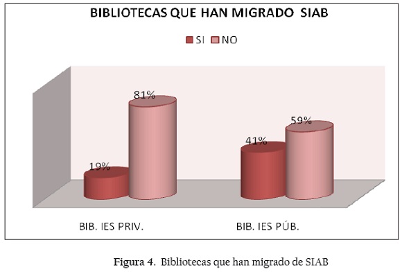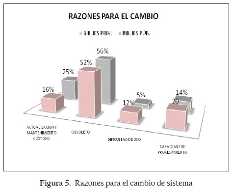 Las instituciones cambian de software cuando éste no cubre las necesidades de su biblioteca, o cuando les resulta muy costoso mantener un sistema. Los resultados analizados mostraron que quienes más han cambiado de sistema son las bibliotecas de instituciones de educación superior públicas (ver Figura 4).