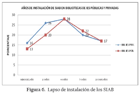 La evolución tecnológica ha abaratado el equipo de cómputo, así como el software, lo que facilita el acceso a la automatización en las bibliotecas. Al indagar al respecto, se encuentran las cifras que revelan el lapso de instalación de los SIAB, y que se presentan en la Figura 6.