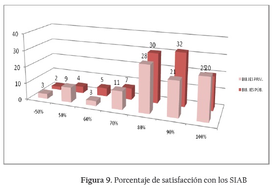 La respuesta más frecuente a esta pregunta, tanto en las EIS públicas como en las privadas, fue la satisfacción en 80%. Por esta razón no cambian su sistema (Figura 9). Quienes están satisfechos con el 80%, lo utilizan para resolver sus necesidades básicas de actividades de gestión de la biblioteca.