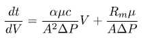 Where: t is the filtration time [s]; V is the accumulated filtered volume [m3]; a the resistance of the cake [m/kg]; ¡i the viscosity of the whey [Pa.s]; c the concentration of protein in the solution [kg/m 3 ]; A the filtration area [m2]; AP the pressure drop in the filter [Pa]; and Rm the resistance of the filter medium [m1].