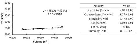 | Protein [%w] | 0.79 ± 0.01 | 0.53 ± 0.01 | 8.67 ± 0.01 | Turbidity [NTU] | 2348 ± 11 | 95.1 ± 1.0 | - |