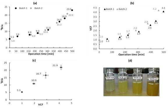 Figure 2 Evolution of a) °Brix and b) VCF, depending on the operating time of the evaporator; (c) relation between VCF and °Brix, and (d) appearance of deproteinized/clarified whey concentrates to VCF of 1.0, 1.9, 3.1 and 4.1. (TFEED= 70 °C, TWALL=70 °C and P = 200 kPa). Mean deviation.