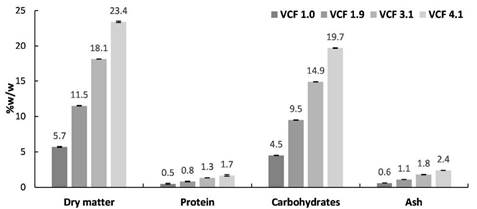It is observed that °Brix and VCF exhibit the same growth trend, where there is a faster increase of values after reaching an FCV of 2, at an approximately constant evaporation rate of 2.3 L/h; this is associated with a lower volume content of water to be removed. The relationship between °Brix and FCV was similar to that obtained by Muvdi-Nova et al.[15] who reported °Brix of 5, 10, 14, and 19, for FCVs of 1, 2, 3, and 4, respectively. On the other hand, the bromatological characterization performed for the whey to VCF of 1, 1.9, 3.1, and 4.1 are presented in Figure 3. There is a linear increase in the content of dry matter, carbohydrates, protein, and ashes with VCF. The final concentrates reached a total solids content between 4.1 and 3.5 times higher than the initial one, for the two processed batches, with compositions like those reported by Tanguy et al.[16] for concentrates of micro and ultrafiltrates of milk, with a VCF of 4.1, 22.4 % of dry matter, 2.5 % of protein and 2.0 %% of ashes. In general, an important separation of whey protein was achieved, which has proven to be an interesting alternative as a low-cost nitrogen source, to be evaluated in subsequent studies. In addition, this removal reduced considerably the fouling of equipment, mainly for the vacuum descending film evaporator, an aspect that had a significant positive effect on the productivity of this unitary operation and allowed to obtain concentrates up to a VCF of 4.1.