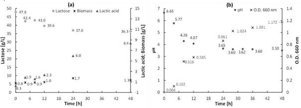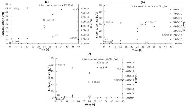 Reference fermentations:The monitoring over time of the concentration of lactose, lactic acid, biomass (dry weight), pH, and O.D.660 nm, for fermentation with reference medium (lactose of reagent degree) without pH control are shown in Figure 4. It is appreciated that only 24.1 % of the available lactose was consumed after 48 h, and low production of lactic acid (8.4 g/L). L. casei grew exponentially until 28 h, with a cellular mass concentration of 1.7 g/L. In the first 24 h of fermentation, there was a decrease in pH, from 6.7 to 3.7, the latter related to the finish of lactose consumption. The concentration of lactic acid showed a significant increase after 24 h, from 6 to 8.4 g/L. That could be related to a formation of mixed product associated with growth, a typical behavior of lactic fermentation [28]. Moreover, the kinetics of lactose consumption, lactate production, and microbial growth for fermentation with pH control from the reference medium using lactose reagent grade are shown in Figure 5. Unlike tests without pH control, the total of available lactose in the medium was consumed, with a production of 43.1 g/L of lactate and a maximum microbial population of 3x1011 CFU/mL. This evidence the importance of pH control in fermentation, considering the strong inhibitory effect exerted in general on the genus L. casei, when the pH of the medium approaches the pk of lactic acid (3.86), as evidenced in Figure 4.