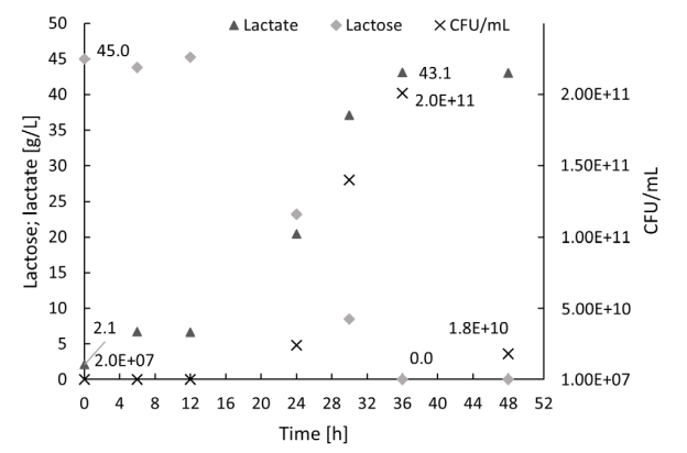 Figure 5 Kinetics of lactose consumption, lactate production, and microbial growth, in reference fermentation with pH control at 6.5 ± 0.3.