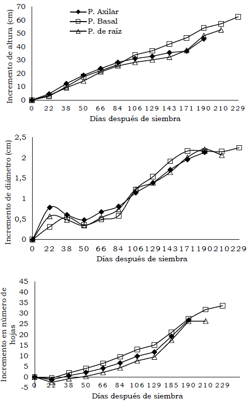 La medición se vio afectada durante el primer mes debido a que la base del tallo quedó por debajo de la superficie del suelo y obligó a realizar la medición del diámetro donde se encontraban las hojas adultas. A medida que pasó el tiempo, las plantas crecieron y la base del tallo se despejó, con lo que se logró, una medición precisa. La tendencia de crecimiento de las plantas de los 3 tratamientos (Figura 1) tiende a ser parecida hasta los 190 dds, posteriormente, el crecimiento es bajo, como ocurrió en las plantas del propágulo basal, o nulo, como en el del tratamiento de raíz.