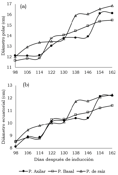 El desarrollo del fruto inicia cuando las flores se marchitan, dejando una estructura globosa donde se evidencian los frutillos producidos por partenocarpia. En la Figura 2, se relaciona el seguimiento del crecimiento del fruto: (a) diámetro polar y (b) diámetro ecuatorial. Las frutas de las plantas del propágulo axilar presentaron una tendencia doble sigmoidea, donde el crecimiento exponencial del diámetro polar se presentó durante los 114 a 130 ddi y 146 a 154 ddi, y del diámetro ecuatorial durante 114 a 122 ddi y 146 a 154 ddi. En cuanto a las frutas del propágulo de raíz, el crecimiento exponencial se presentó durante los 130 a 138 ddi para ambos diámetros. En el caso de las frutas de las plantas del propágulo basal, el crecimiento exponencial se presentó durante los 114 a 122 ddi, posterior a este tiempo, el crecimiento se ralentizó.