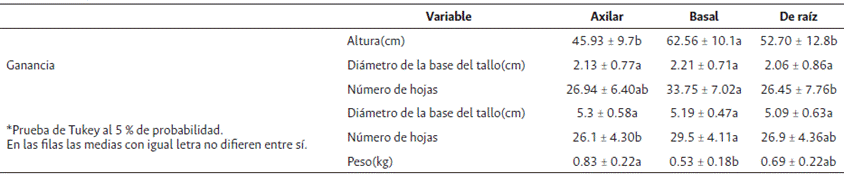 De acuerdo con la prueba de Tukey (Tabla 2) las plantas del propágulo basal obtuvieron la mayor ganancia de altura (62.56 cm) y número de hojas (33.75 hojas) durante la etapa de crecimiento y desarrollo de hojas. En cuanto al diámetro de la base del tallo es igual en los 3 tratamientos.