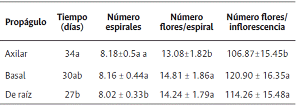 El proceso de antesis es consecutivo y en forma de espiral ascendente en la inflorescencia; su duración depende del número de flores formadas. El tiempo de duración de la etapa de floración para las plantas provenientes del propágulo axilar fue de 34 días (desde los 57 hasta 90 ddi), para aquellas del propágulo basal de 30 días (57 a 85 ddi) y para las del propágulo de raíz, 27 días (59 a 85 ddi). Este tiempo fue diferente en el propágulo axilar y de raíz, siendo este último el que presentó una floración en menor tiempo. Se cuantificó el número de espirales, el número de flores por espiral y el total de flores por inflorescencia de cada propágulo (Tabla 4). En cuanto al número de espirales se puede observar que las plantas provenientes de los propágulos axilar y basal no tienen diferencia significativa y presentan la mayor cantidad de espirales con respecto al propágulo de raíz. En cuanto al número de flores por espiral y el total de flores en la inflorescencia, los propágulos basales y radicales tienen la mayor e igual cantidad flores.