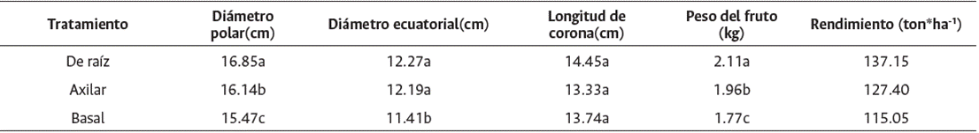 De acuerdo con la prueba de Tukey las frutas provenientes del propágulo de raíz tienen el mayor D. polar y peso de fruto, y las provenientes del propágulo basal tienen el menor D. polar, D. ecuatorial y peso de fruto (Tabla 5).