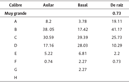 De acuerdo con la Norma para la piña CXS 182- 1993 (Codex Alimentarius, 2011) el fruto de la piña se puede clasificar según su peso en gramos (g): muy grande >3000, categoría A=2750, B=2300, C=1900, D=1600, E=1400, F=1200, G=1000 y H=800. Cuando la fruta está por fuera del rango establecido, ya sea por ser de mayor o menor tamaño, no es comercializable como fruta fresca. En la Tabla 6 se puede observar el porcentaje de fruta de cada tipo de propágulo correspondiente a cada categoría. La fruta más dispersa se presenta con el propágulo basal. La mayor cantidad de fruta de todos los tratamientos se ubica en las categorías B y C (peso promedio entre 1.9 y 2.3 kg), seguido por la categoría D (peso medio 1.6 kg).