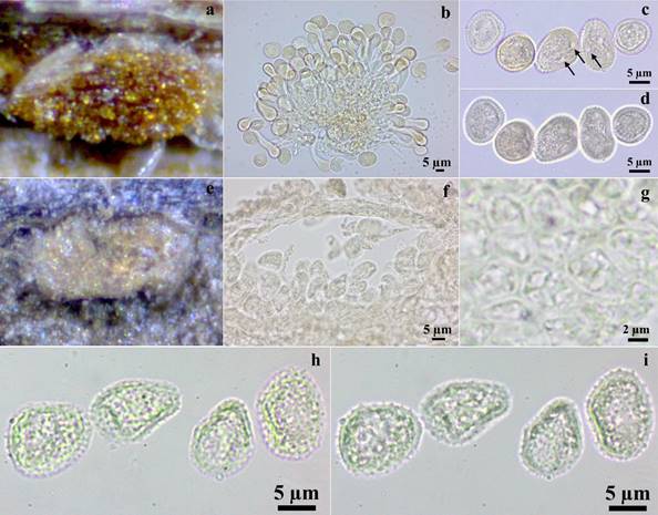 Figura 1 a-d. Puccinia digna. a. Uredosoro. b. Paráfisis. c-d. Uredosporas. c. En vista mediana con poros dispersos (flechas). d. En vista superficial. e-i. Pucciniastrum circaeae. e. Uredosoro. f. Sección transversal del uredosoro. g. Células peridiales. h-i. Uredosporas. h. En vista mediana. i. En vista superficial.