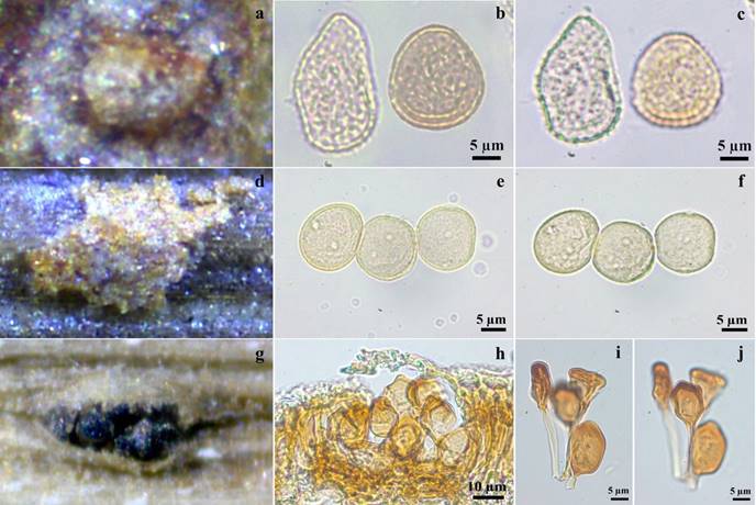 Figura 2 a-c. Uredo chrysophyllicola. a. Uredosoro. b-c. Uredosporas. b. En vista mediana. c. En vista superficial. d-j. Uromyces sporobolicola. d. Uredosoro. e-f. Uredosporas. e. En vista mediana con poros germinativos ecuatoriales (flechas). f. Uredosporas en vista superficial. g. Teliosoro. h. Sección transversal del teliosoro. i-j. Teliosporas. i. En vista mediana. j. En vista superficial.