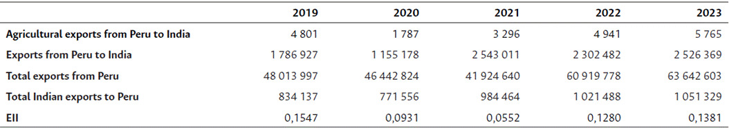 Agricultural trade between Peru and India from 2019 to 2023 shows an evolution marked by fluctuations in both exports and imports. Despite the decline in the trade intensity index during 2020 and 2021, a notable recovery was evidenced in 2022, followed by further growth in 2023, resulting in an average annual growth of 15 %. On the other hand, agricultural imports from India have grown at a moderate rate of 7 % per year. These figures reflect that while there is growth potential, bilateral agricultural trade still faces obstacles that hinder its full consolidation.