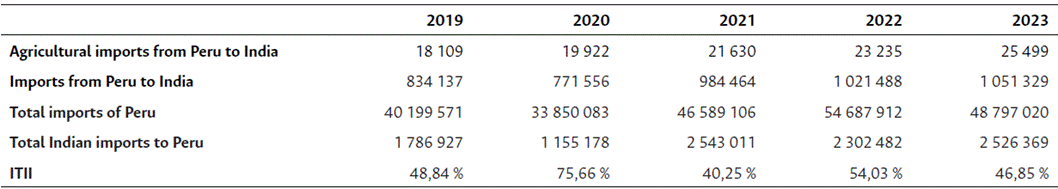 In Table 2, the trade intensity index of Peruvian agricultural imports from India increased by 55 % in 2020 compared to 2019. In 2021, it decreased by 47 %, while in 2022, it increased again by 34 %. In 2023, the decrease was 13 %. This suggests that, on average, the trade intensity of agricultural imports has grown at an average annual rate of 7 %.
