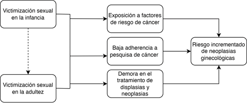 Teniendo en cuenta el creciente interés por los determinantes sociales en este tipo de enfermedades, Hindin et al. desarrollaron un modelo teórico sobre las posibles vías de asociación entre la victimización sexual (vs), tanto la sufrida en la infancia como en la adultez, y este tipo de neoplasias4. Los autores basaron su modelo en la revisión de la literatura, encontrando que esta asociación se daría mediante distintas variables moderadoras, agrupadas en tres vías alternativas (véase Figura 1): en la primera, la asociación estaría mediada por factores de riesgo bien conocidos para las neoplasias ginecológicas como, por ejemplo, las conductas sexuales de riesgo y las infecciones de transmisión sexual (its). Se ha reportado que las mujeres que sufren experiencias de victimización, como el abuso sexual durante la infancia, comparten los mismos factores de riesgo para las neoplasias ginecológicas en la adultez5. En la segunda vía, la asociación se daría a través de una escasa adherencia de las mujeres a las recomendaciones de acceder a prácticas de prevención de cáncer ginecológico. La literatura reciente ha encontrado que las mujeres con antecedentes de vs a lo largo de la vida tienen menos probabilidad de realizarse cualquier examen de control de neoplasia ginecológica (test de Papanicolaou, mamografía, examen clínico de mamas)6. Una posible explicación a esto es que estas prácticas podrían recordar la experiencia traumática del abuso, por lo que serían evitadas por las mujeres que las sufrieron. Por último, la tercera vía ha sido la menos explorada y postula que la asociación se daría por el incumplimiento, la discontinuidad o la demora en intervenciones tempranas luego de un resultado patológico en examen de control de neoplasia ginecológica. La evidencia sugiere que las mujeres víctimas de vs poseen menos apoyo social y económico, constituyéndose en una barrera para el seguimiento adecuado de este tipo de lesiones proliferativas4,7.