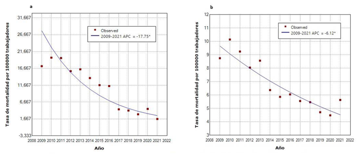 En resumen, durante el período de 2009 a 2021, se observó una tendencia decreciente en la mortalidad de origen laboral y ocupacional. Esta disminución puede atribuirse, en parte, a mejoras implementadas en términos de seguridad social, promoción de empleo digno y el desarrollo de sistemas de gestión más avanzados en seguridad y salud laboral. Sin embargo, es importante destacar que las tasas de mortalidad laboral aún distan de igualarse a las de otros países de ingresos medianos. Además, existe la necesidad imperante de que los sistemas de vigilancia en salud laboral y ocupacional den cuenta de analizar más detalladamente la mortalidad y los incidentes laborales en la población no formal, para obtener una comprensión más completa de esta problemática.