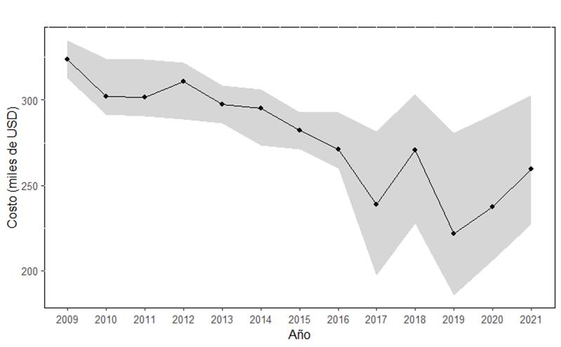 Se estimó que el valor de pérdidas económicas en el pib por todos los apvp para el periodo del estudio fue de usd 2 236 335 174 (véase Figura 2), oscilando entre los usd 25 270 104 y usd 301 790 658 por año.