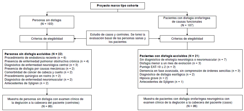 Los dos grupos se tomaron de un estudio marco de cohorte que busca desarrollar una metodología clínica para el diagnóstico y el seguimiento de la disfagia orofaríngea mediante la integración de señales no invasivas y variables clínicas. Dicho estudio se llevó a cabo entre marzo del 2019 y diciembre del 2022, y contó con una muestra calculada de 76 pacientes con disfagia orofaríngea neurogénica y 76 personas de control, considerando una sensibilidad del Examen Clínico de la Deglución a la Cabecera del Paciente (ECD-CP) del 80 %, según lo reportado en la literatura 17.