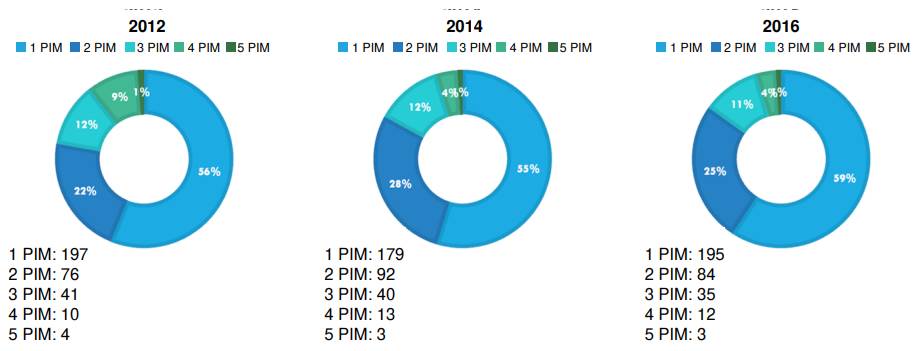 Additionally, this approach may have influenced the stability in the prevalence of this type of medication used over time. Among participants who had sustained exposure to this type of medication, just over half received one drug, nearly a quarter received two, and a little over 10% received three potentially inappropriate medications at each of the three-time points analyzed.