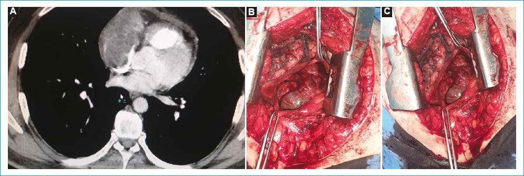 Un hombre de 19 años de edad sin antecedentes significativos quien reportó disnea progresiva de 5 meses de evolución. Fue remitido para estudio de una neoplasia hematolinfoide y una masa mediastinal asociada a un síndrome de vena cava superior. El estudio inicial se realiza con resonancia magnética cardíaca donde se observa una masa que ocupa el mediastino anterior y medio con infiltración tumoral de la vena cava superior y oclusión de la luz de este vaso con prolapso a la aurícula derecha, cuyos diámetros son de 5x3 cm, y sin otras alteraciones estructurales o funcionales (Fig. 1). Ecocardiograma sin derrame pericárdico, con una masa dentro de la aurícula derecha procedente de la vena cava superior de aspecto ecodenso homogéneo que evidentemente sobresale a la cavidad de la aurícula derecha en un 30%, comprometiendo la porción del tabique relacionada con la vena cava superior, así como la aorta ascendente, con el hallazgo de una masa hipodensa de aspecto homogéneo que la rodea y se extiende hacia el mediastino posterior y ocupa el seno transverso. Se describe una fracción de eyección preservada sin anomalías valvulares. El paciente fue llevado a biopsia por toracoscopia, encontrando el lóbulo superior derecho severamente adherido al mediastino, fibrosis severa alrededor de la vena cava superior y la vena ácigos, estando esta última severamente dilatada. Existe una distorsión importante de los planos anatómicos, por lo cual es necesario cambiar a una toracotomía anterolateral. Se continúa con el procedimiento y se encuentra una masa intracardiaca a nivel de la aurícula derecha y la vena cava superior, con circulación colateral severa en la pared torácica y en la pleura parietal anterior. La histopatología reporta un linfoma de células B grandes. El paciente presenta una adecuada evolución postoperatoria y se inicia el proceso de remisión con la Entidad Prestadora de Servicios (EPS) dentro del contexto de una emergencia oncológica dada por un síndrome de vena cava superior.