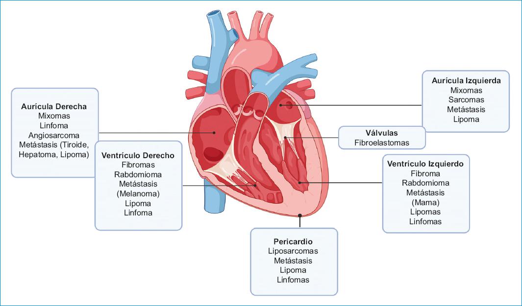 Figura 2 Ubicaciones anatómicas de tumores cardíacos primarios y secundariosFuente: elaboración propia.