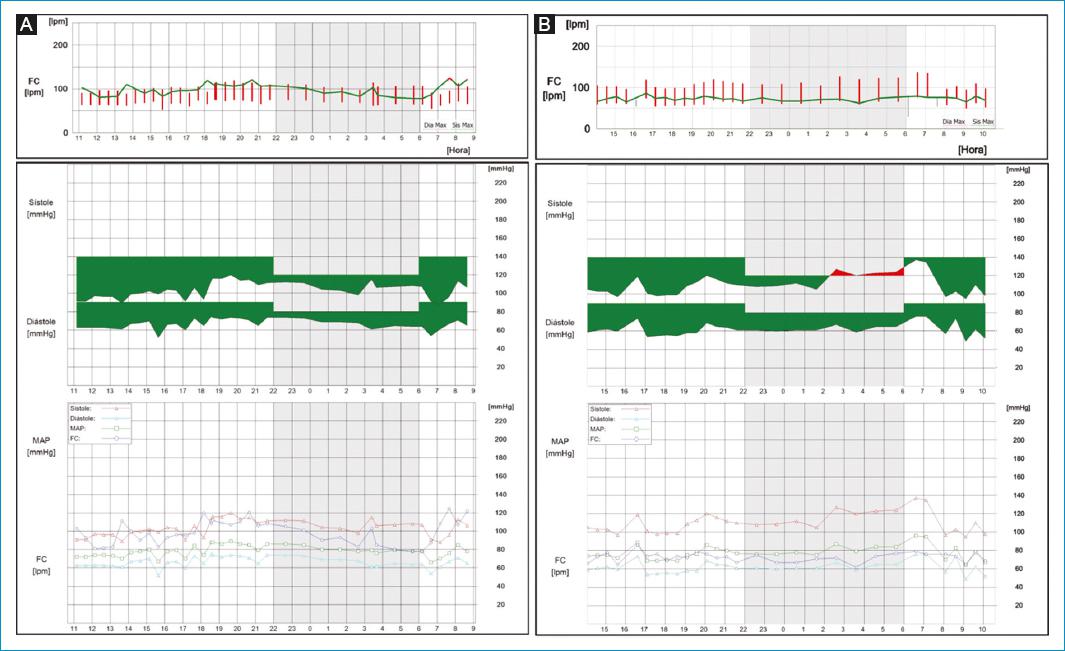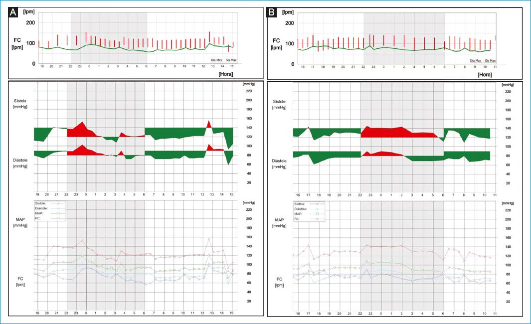 Figura 1 MAPA de dos pacientes del Grupo I, o ingenuos. A: el fenotipo de este paciente muestra una carga de PAS y un IHB del 0%, lo cual indica que no existía un área «roja» por encima de los valores normales del ancho de banda de la PA nocturna. La relación fue de 1.049 (relación > 1). B: se observa otro fenotipo de este grupo con una carga sistólica del 38% (3 de 8 mediciones anormales) y un IHB de 17 mmHg/hora, dando una relación de 1.074. A este grupo de RDP se le denominó «ingenuo» porque no tenía hipertensión ni de día ni de noche (< 135/85 mmHg; < 120/70 mmHg, respectivamente).