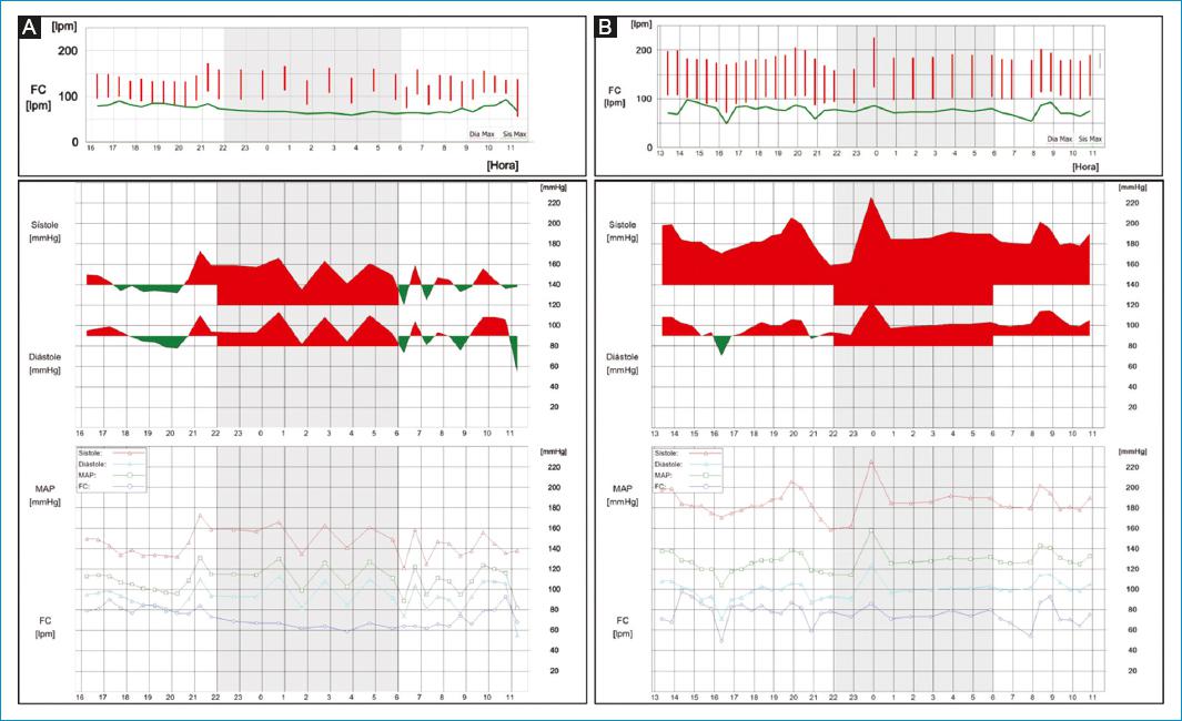 Figura 3 Dos pacientes del Grupo III caracterizados por tener una carga de PAS nocturna del 100%. A: además de la elevada carga de PAS nocturna, el fenotipo muestra un IHB críticamente elevado (333 mmHg/hora) con algunos valores anormales elevados de PAS diurna (48%), resultando en una relación de 1.077. B: muestra cargas de PAS y niveles de IHB críticamente elevados tanto de día como de noche, con valores de 24 horas del 100% de carga sistólica e IHB de 1270 mmHg/hora, dando una relación de 1.027.