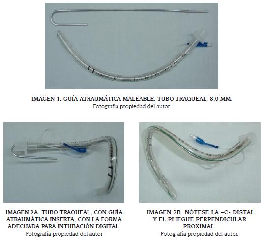Inicialmente se prepara el tubo orotraqueal insertándole la guía atraumática previamente lubricada. A continuación, se pliega el tubo formando una curva distal en C con un doblez perpendicular proximal (Imágenes 2A y 2B).