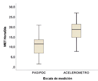 Los coeficientes de correlación de Pearson para la variable MET/hora/día fueron bajos (rho = 0,2; p = 0,1) entre las mediciones con el acelerómetro y la escala PASIPD-C. Se apreciaron diferencias estadísticamente significativas (t = 14,5; p = 0,0) al comparar las medias del gasto metabólico en las mediciones con PASIPD-y acelerometría (10,9 ± 4,9 vs 18,1 ± 4,7 MET/hora/día). En la Figura 1 se aprecia el diagrama de cajas y bigotes del gasto metabólico (MET/hora/día) con PASIPD y acelerómetro.