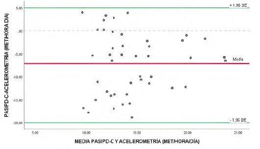 En el gráfico de Bland Altman se pudo apreciar que las mediciones con PASIPD-C y acelerometría mostraron bajos niveles de concordancia. El promedio de las diferencias fue -7,1 ± 6,6 MET/hora/día con intervalos de confianza al 95 % de 5 a -20 MET/hora/día. El 84 % de las diferencias en las mediciones obtuvo valores negativos.