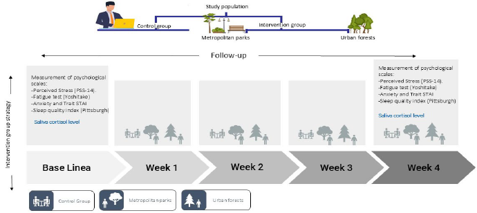 Upon the participant's agreement to join the study and confirmation of meeting the eligibility criteria, a unique code was assigned. Using a random number generator in Excel®, participants were then randomly distributed into three distinct groups: a control group, an intervention group in metropolitan parks, and an intervention group in urban forests (Figure 1).