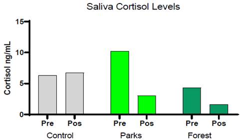 Finally, salivary cortisol levels were measured across all groups. In the control group, the mean cortisol level at baseline was 6.5 ng/mL, with an increase of 0.4 ng/mL observed after the intervention (Figure 2). In the metropolitan parks group, the baseline cortisol level averaged 10.7 ng/mL, followed by a reduction of 2.6 ng/mL post-intervention. Similarly, in the forests group, the initial cortisol level averaged 4.3 ng/mL, with a subsequent decrease of 2.7 ng/mL after the intervention.