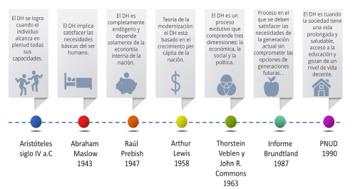 Aristóteles es uno de los primeros en hablar sobre "desarrollo humano", y consideraba que alcanzar la plenitud del florecimiento de las capacidades humanas es el sentido y fin de todo individuo (Correa, 2021). Posteriormente, Abraham Maslow alude que el DH implica satisfacer las necesidades básicas (fisiológicas, seguridad, afiliación, reconocimiento y autorrealización) (Aguilar Salmerón, 2018). Después surgen teorías que igualmente muestran una visión sobre lo que es el DH. Una de las primeras es la teoría estructura-lista, que surge en América Latina en 1947 y cuyo representante, Raúl Prebish, asevera que no existen o deberían existir los países subdesarrollados, argumentando que el desarrollo es completamente endógeno y depende solamente del consumo interno (Rapoport y Guiñazú, 2016).
