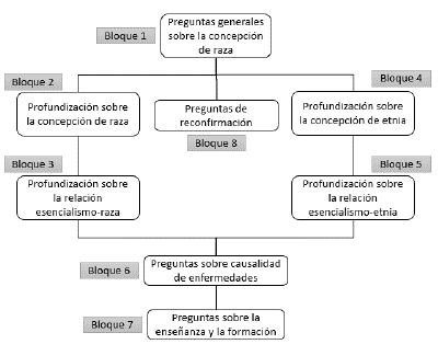 El bloque 1 tiene como objetivo caracterizar las concepciones de los encuestados sobre el concepto de raza humana. Hacia el final del bloque, se solicita que indiquen su grado de acuerdo respecto a si la humanidad puede dividirse en razas o etnias. Según la respuesta, se procederá al bloque 2 (si prefieren usar el concepto de raza) o al bloque 4 (si prefieren usar el concepto de etnia). Estos bloques buscan analizar la concepción de raza o etnia, respectivamente, desde los aspectos biológicos y socioculturales. Los bloques 3 y 5 tienen como objetivo analizar qué supuestos del esencialismo aparecen asociados al concepto de raza o etnia, respectivamente. El bloque 6 tiene como propósito analizar el tipo de causa (biológica, sociocultural o una interacción entre ambas) que se prioriza para explicar una condición de enfermedad en relación con la raza. Este bloque no fue objeto de validación en este artículo, dado que sus preguntas no incluyen variables continuas. El bloque 7 permite conocer la formación de los encuestados en esta temática y cómo abordan (o abordarían) este tema en clase. Este bloque tampoco fue objeto de validación, ya que sus preguntas eran de carácter abierto. Por último, el bloque 8 incluye preguntas que responderán solo aquellos participantes que, en el bloque 1, hayan declarado no estar de acuerdo ni con el concepto de raza ni con el de etnia. El objetivo es confirmar que la persona encuestada considera que las categorías de raza o etnia no son válidas.