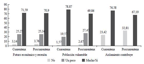 El porcentaje de personas con preocupaciones económicas sociales es mayor que el de personas con preocupaciones económicas personales; algo que sorprende positivamente en una sociedad con altos niveles de desigualdad. No obstante, este porcentaje disminuyó de manera importante en el periodo de poscuarentena. Los más jóvenes tienen menor probabilidad de tener estas preocupaciones, mientras mujeres y personas más informadas tienen mayor probabilidad de tenerlas.