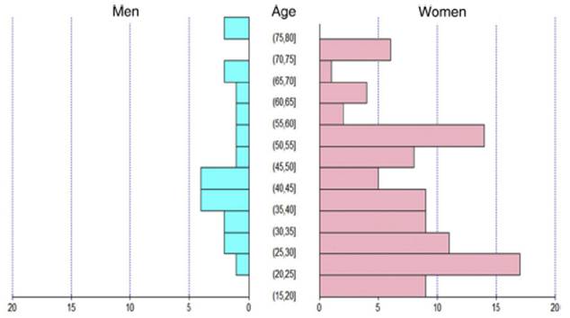 122 patients were included, of which 100 (81.9%) were women and 22 (18.1%) were men. The evolution time in months (SD) was 41.6 (±4.4) and the age at diagnosis in years (SD) was 39 (±1.5), although there was a higher prevalence in the 20-25 years and 50-55 years treatment groups (see Fig. 1). When cal culating the mean of the SLEDAI activity score, the result was 12.5 (±1.0) points for severe flare, while the accumulated dam age through SLICC/ACR-DI (SD) was 2.29 (±0.19) points. The estimated prevalence of neuropsychiatric affection (NPSLE) was 59%.