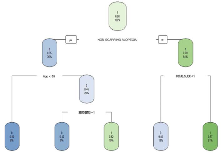 Non-scarring alopecia, oral ulcers, anti-Ro/SSA seropositivity, and leukopenia/lymphopenia were the most important variables for predicting neuropsychiatric affection using deci sion trees, with an accuracy of 75% (95% CI 0. 58-0.88), moderate sensitivity (57%) and high specificity (86%). These variables are more useful for ruling out the entity in those who do not present them, as well as a good predictive power regarding positive and negative predictive values (72% and 76%, respectively).