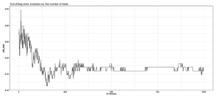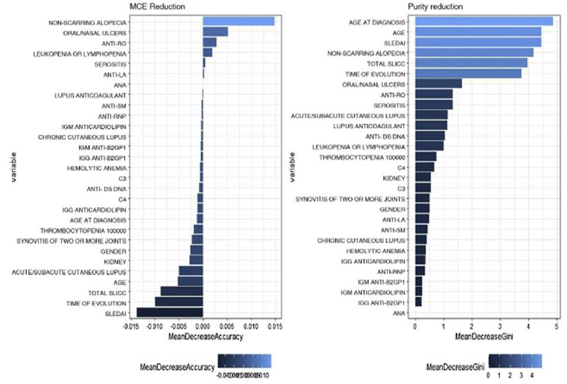 Additionally, the most important variables related to the reduction of mean classification error and purity were explored (see Fig. 3) and it was shown that the variables that most contributed to the prediction model were again: non-scarring alopecia, oral ulcers, and anti-Ro/SSA. In addition, the reduction of the OOB concerning the number of trees and vari ables was explored (see Fig. 4) and 25 variables with 750 trees were considered for the new Bagging, without major variation in the OOB or in the accuracy of the model.