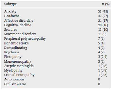 In the group of patients with neuropsychiatric manifes tations, it was found that anxiety disorders were the most frequently found (43%), followed by headache (27%) and affec tive disorders (16%) (see Table 2).
