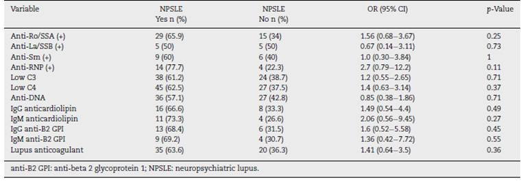 When analyzing the different autoantibodies, despite that most of them were more frequent in the group of subjects with neuropsychiatric affection, none reached statistical sig nificance (see Table 3).