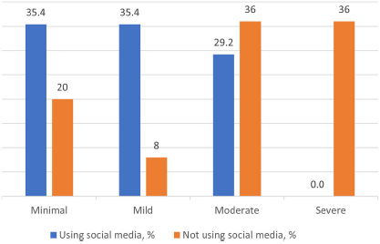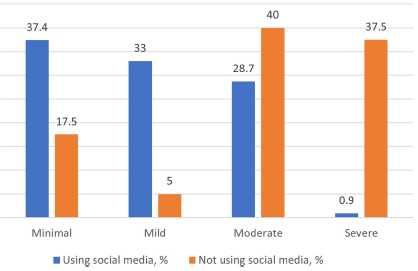 Demographic findings of the AS patients are shown in Table 1. The depression scores between the patients who used the Internet (12.18 ± 6.85) and social media (12.35 ± 6.90) were compared with those who did not (27.19 ±10.51 vs. 25.20 ±11.66) and a significant difference (p< 0.001) was found. Smart phone users were in the majority (73.5%). What-sApp was the most preferred social network (66.5%), followed by Facebook (52.9%), Instagram (52.3%), Twitter (19.4%), and Pinterest (5.8%). The percentage of patients who use social media for searching about health-related information is 68.9%. Facebook was the most preferred social network for the information (45.9%). Information sources among social media users were following their rheumatologist and other healthcare givers and/or rheumatology patients. Social media users and non-users were similar according to their age, gender or educational status, and marital status. There were no significant differences between the type and duration of social media with the depression score. There were no differences in the prevalence of depression between users of the different social networks. Moreover, based on a cut-off of 3 types of social media, there was significant difference in the status of depression among patients (<3, n: 64, 14.71 ±6.77, vs. ≥3, n: 51, 10.47 ± 6.45, p ≤ 0.001). There was no difference in depression scores according to site, age, and number of households. A weak correlation was observed between the BASDAI/BASFI and BDI-IA depression variables (r= 0.167, p = 0.019; r= 0.188, p = 0.022, respectively). There was a significant difference among the severity of depression in terms of the use of social media (p ≤ 0.001) (Fig. 1). Furthermore, social media had a positive effect on the severity of depression in patients who were using tumor necrosis factor inhibitors (TNFi) (p ≤ 0.001) (Fig. 2). Of the Internet users, 41.2% did research on AS prior to their diagnosis, and 77.9% did research after their diagnosis. Moreover, 70.8% searched for the treatment online, and 36.6% of the TNFi users searched the internet prior to undergoing treatment.
