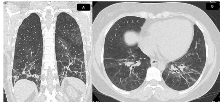 Figura 5 Tomografía de tórax con hallazgos de EPI. Tomografía de tórax en corte coronal (A) y axial (B). Se evidencia vidrio esmerilado de distribución peribroncovascular, con mayor afectación de segmentos posteriores y lóbulos inferiores, donde se identifican reticulación, bandas parenquimatosas, engrosamiento de paredes bronquiales y bronquiectasias de tracción con pérdida de volumen asociada, debido a retracción de cisuras. Hallazgos compatibles con patrón de NINE fibrótica. Extensión calculada del 30%.