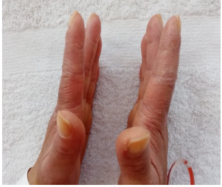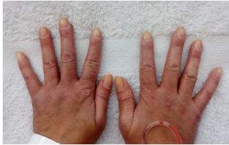 Figura 2 Manos de mecánico. Se evidencian hiperqueratosis y fisuras cutáneas en la cara radial del primer y el segundo dedo de ambas manos. Imagen compatible con el signo de «manos de mecánico».