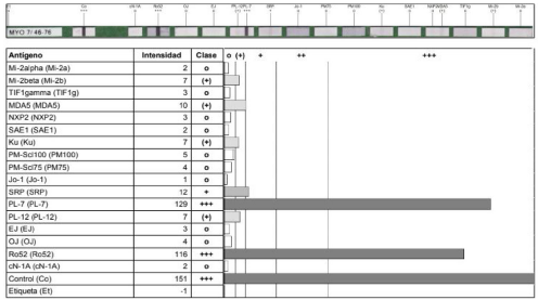 Figura 3 Kit de anticuerpos para miopatías inflamatorias tomado en febrero del 2021. Anticuerpos específicos de miopatías inflamatorias y síndrome antisintetasa con evidencia de títulos altos para anticuerpos anti-PL7 y anti-Ro52.