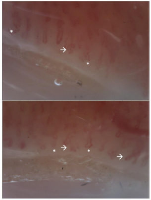 Figura 4 Video-capilaroscopia. Lecho vascular con edema marcado de papila, tortuosidades lineales y en su mismo eje (*), sin microhemorragias ni megacapilares. Se evidencian ramificaciones (flecha). Patrón anormal, correspondiente a patrón no escleroderma. La presencia de múltiples ramificaciones sugiere la presencia de dermatomiositis.