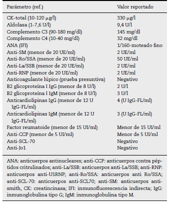 En los exámenes de laboratorio de diciembre del 2020 se evidenció: leucocitosis ligera, función renal normal, uroanálisis sin alteraciones, perfil lipídico normal, función tiroidea normal, leve elevación de la creatincinasa total y de la aldolasa, además de elevación de las transaminasas. La radiografía de tórax de octubre del 2020 presentaba opacidades en vidrio esmerilado de distribución periférica en ambos campos pulmonares. En diciembre del 2020 se realizó una tomografía de tórax (TACAR) con hallazgos de parches de vidrio esmerilado de distribución periférica y aleatoria en ambos campos pulmonares, con compromiso aproximado del 20% del parénquima pulmonar. El perfil inmune se presenta en la tabla 1. Durante su hospitalización de diciembre del 2020 se realizó un ecocardiograma transtorácico, sin alteraciones, en tanto que en la caminata de 6 min se observó una caída de la saturación de oxígeno (SatO2) durante el ejercicio como único hallazgo patológico. La espirometría con curva flujo volumen encontró un volumen espirado forzado en el primer segundo (VEF1), con disminución de moderada a severa y capacidad vital forzada (CVF) normal.