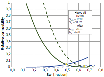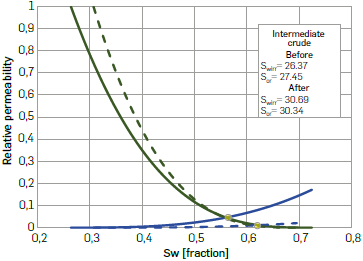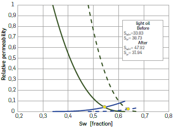 CHANGES IN RELATIVE PERMEABILITY. The effectiveness of the treatment is determined by comparing the effective permeability of each phase before and after the injection of the Relative Permeability Modifier (RPM), quantified by the Residual Resistance Factor (RRF) value for each phase. This method yields the most accurate results.