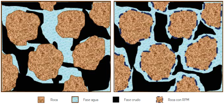 The adsorption of RPM polymer onto the rock surface significantly alters fluid distribution within the porous medium. This process enhances the rock's water-wetting characteristics, causing water to relocate towards pore walls and throats. Consequently, it modifies the irreducible water saturation-typically increasing it-and impacts water mobility. These changes create a more friendly scenario for crude oil flow in the treated near-wellbore region. As depicted in Figure 2, a rock exhibiting mixed wettability will adsorb Relative Permeability Modifier onto its surface, resulting in an additional impediment to flow due to polymer adsorption. However, this impediment is more pronounced for the water phase flow due to the chemical properties of the RPM. The polymer, upon adhering to the rock surface, serves three primary functions: